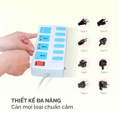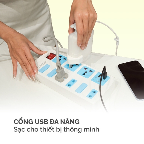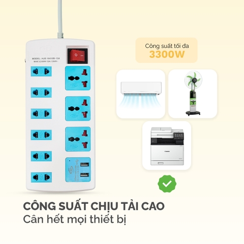- 10410B USB: 6 lỗ cắm 2 chấu, 3 lổ cắm 3 chấu, có USB , 1 công tắc, công suất tối đa 3.300W
